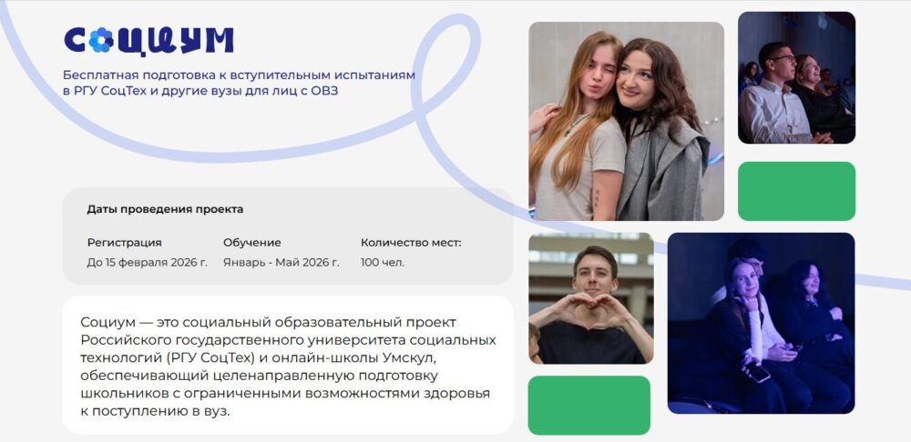 Федеральное государственное бюджетное образовательное учреждение инклюзивного высшего образования «Российский государственный университет социальных технологий» (РГУ СоцТех), уникальный и единственный в стране Университет, специализирующийся на обучении студентов с инвалидностью, совместно с партнером – Частным учреждением дополнительного образования «Онлайн-школа подготовки к экзаменам «Умная школа» — с января 2026 года запустил социальный благотворительный проект «СОЦИУМ».
